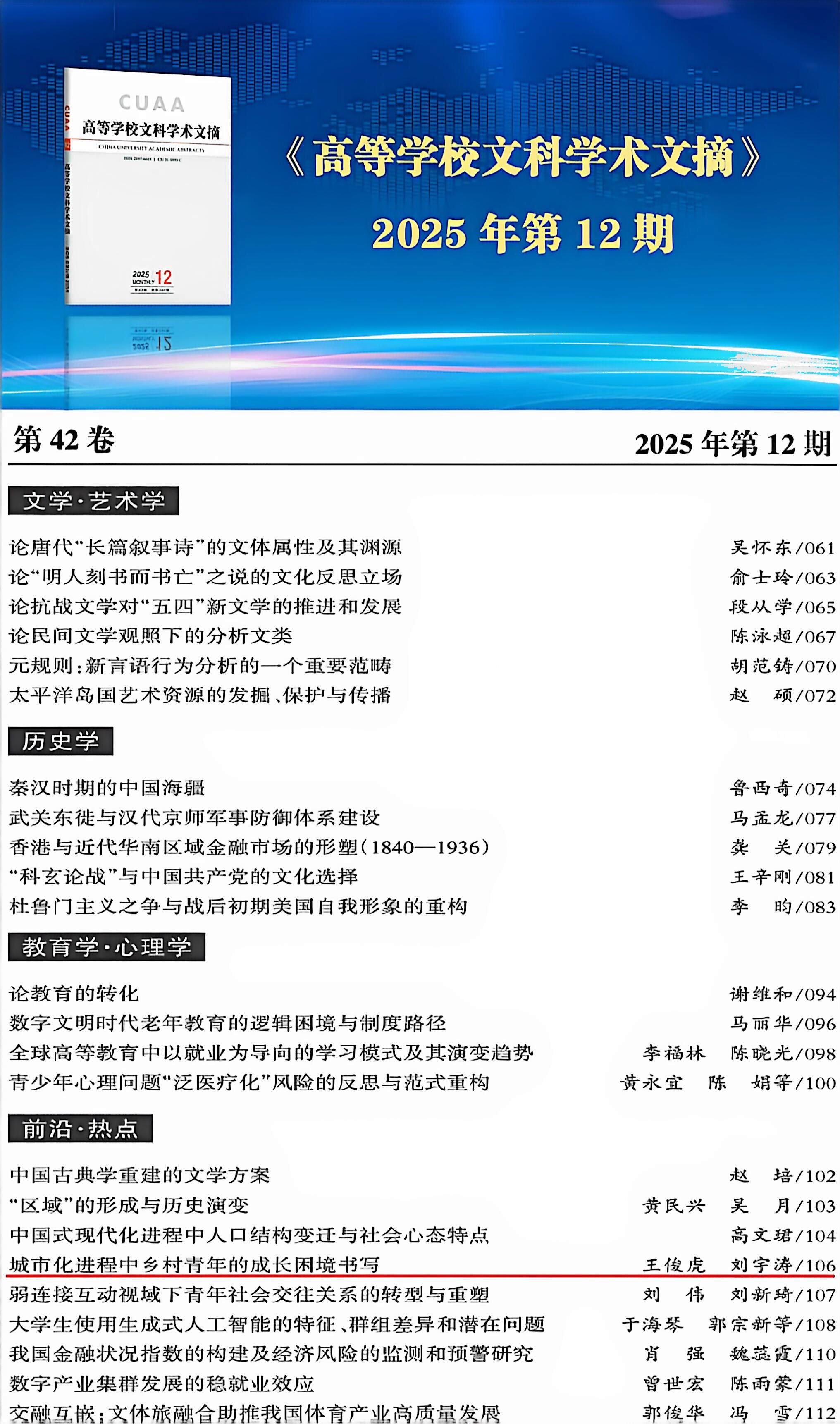 近日,我校文学院二级教授王俊虎发表于《信阳师范大学学报(哲学社会科学版)》2025年第5期的学术论文《城市化进程中乡村青年的成长困境书写》被《高等学校文科学术文摘》2025年第12期转载。