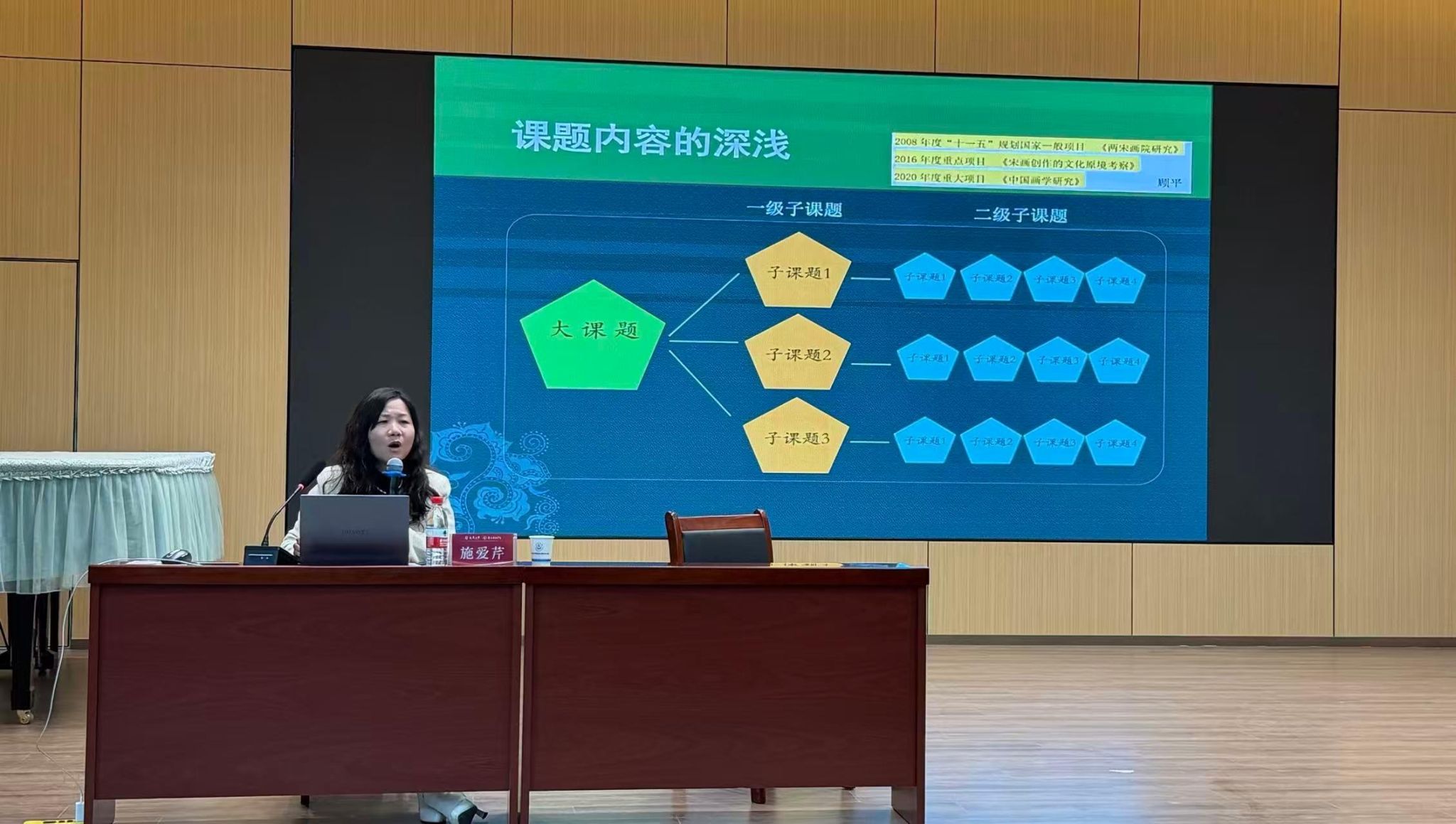 本次报告施爱芹教授结合自身连续三次获批国家社科基金艺术学项目的经历,以初次获批国社科艺术学项目为切入点,用生动的案例打破了师生们对高水平学术研究高不可攀的刻板印象,也迅速拉近了与师生的距离。随后,她围绕艺术类教师的学术成长路径展开,重点探讨了如何结合音乐、舞蹈、美术、设计的学科建设方向和专业特长,制定清晰的学术生涯规划,系统讲解了国社科艺术学、教育部人文社科等高水平科研项目申报的策略和要点,并从选题创新、论证撰写与团队组建等核心环节,进行了全流程的精细化指导。